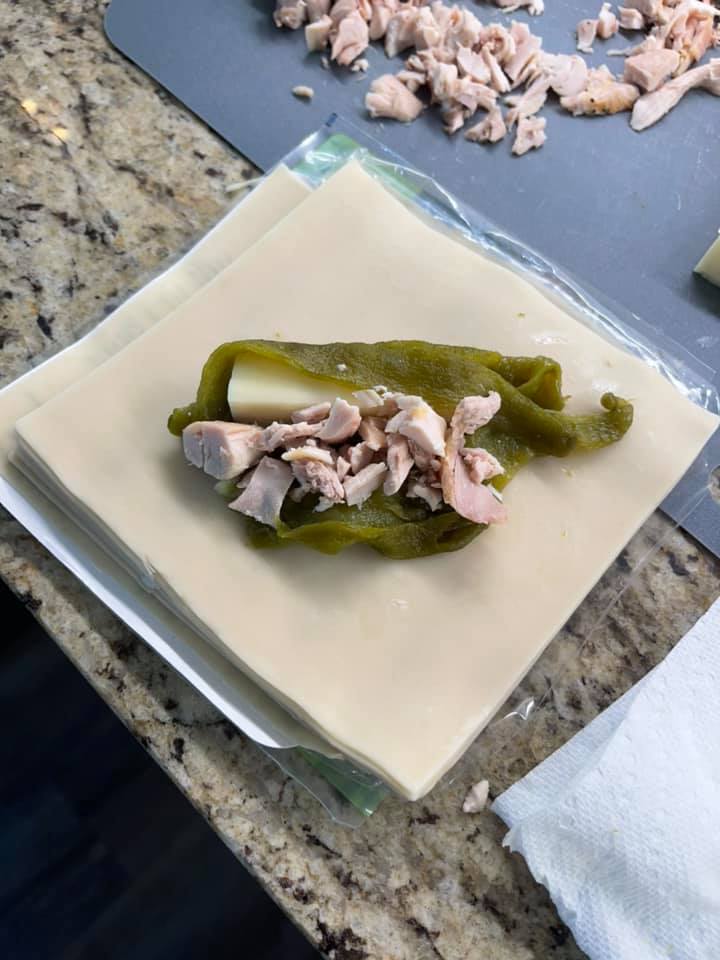 Lay an egg roll wrapper on a clean surface. Place one roasted green chile in the center, then spoon some of the chicken and cheese mixture on top.